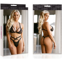 Průsvitná souprava dámského spodního prádla se sexy pásky. Sada obsahuje měkkou podprsenku s předním zapínáním, bez regulaceramnek. Sada obsahuje také odpovídající tanga. Dekorativní pruhy prádla krásně odhalují břicho, pas, záda a poprsí, ještě silněji zdůrazňují své smyslné tvary. Sada zdůrazňuje ženské tělo, takže je dokonalým prvkem předehry.