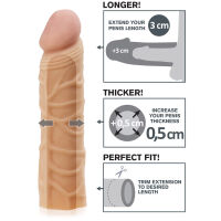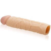 Zaskočte svoji partnerku rozměrem svého penisu! Návlek mrknutím oka prodlouží a zvětší objem vašeho penisu.Každá žena pohledem na něj oněmí z úžasu a prožitky, které jí dopřejete ji přivedou na samotný vrchol rozkoše.Spousta žilek, zvětšený žalud, velmi příjemná na dotyk kůže cyberskin, to vše se přičiní k tomu, že se bude přímo vznášet rozkoší. Návlek navíc dokáže oddálit ejakulaci, takže se budete moci radovat z velmi dlouhého sexu se svojí milovanou partnerkou. Konečně ji dokážete uspokot tak, jak si to vždy přála. Návlek je mimořádně elastický. Roztahuje se a dokáže se přizpůsobit každému rozměru .