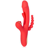 Tento gadget nepozná pojem „príliš veľa“. Vytvorený s ohľadom na komplexné potešenie, vás rozmaznáva z každej strany – doslova. Červený, horúci ako zakázaný bozk, spája v sebe tri zmyselné funkcie: pulzujúci hriadeľ s funkciou vibrácie, elastický análny stimulátor s guľkovým tvarom a malý, ale inferne účinný jazýček, ktorý sa postará o vaše vnútorné napätie s chirurgickou presnosťou. A k tomu ešte vibrujúci stimulátor klitorisu, ktorý si neberie prestávky. Tri zóny, sedem režimov každej – toto nie je hra, to je celý repertoár rozkoše. A všetko máte pod kontrolou.